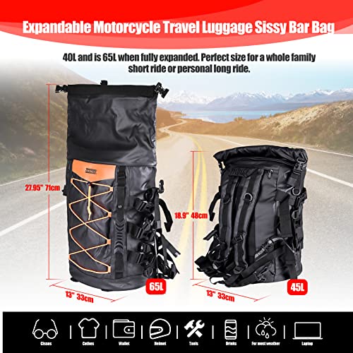 【Maximum Storage】 40L and is 65L when fully expanded. Perfect size for a whole family short ride or personal long ride. This big roomy sissy bar Shuttle luggage bag will carry everything you would wish to take with you on a long/short ride. This duffel bag provides a great way to store your needed items in a protected and convenient location.