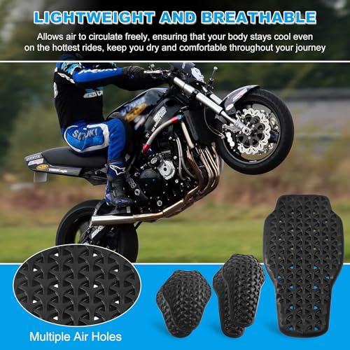 【Breathable & Flexible】The look of the back protector is the sculpted weave design, so the motorcycle pads are perforated to allow airflow, especially on your mesh jacket in hot weather, more flexible and breathable than the usual foam protective pads.