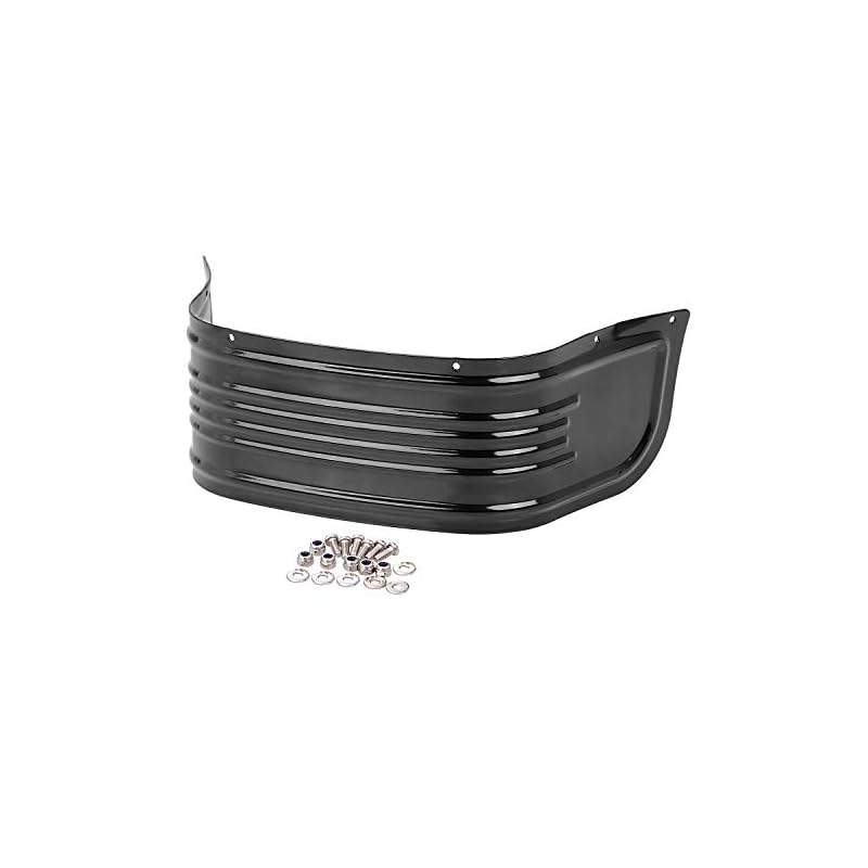 this shaped steel fender skirt features four raised accent ribs that wrap across the rear so as to add depth and texture.